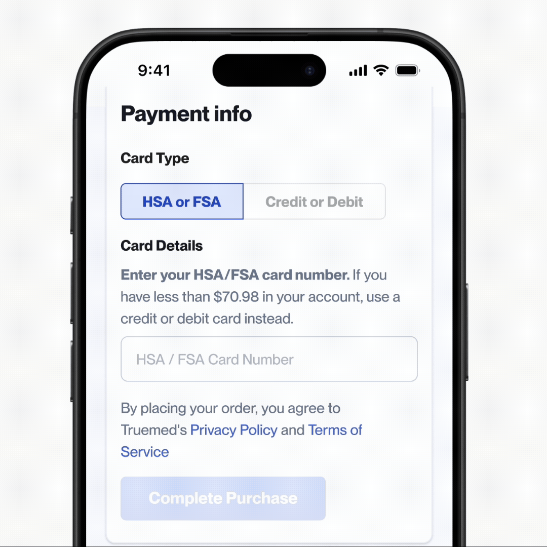 Do not pay with an HSA/FSA card during checkout. After your purchase, check your confirmation screen for a link to the Truemed survey.